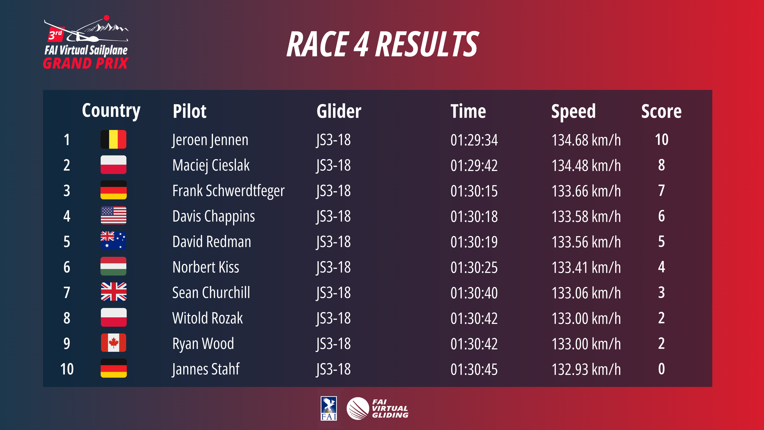 CELJE/NOETSCH, 6 January 2026 – The wait is finally over, and the variometers are screaming. After a two-week hiatus, the 3rd FAI World Virtual Sailplane Grand Prix Final resumed today with Race 4, and the "Spring" weather preset threw a curveball that caught the grid off guard. Gone were the booming ridge runs of Week 1; today was a battle for survival in weak, broken lift where patience was the only fuel.