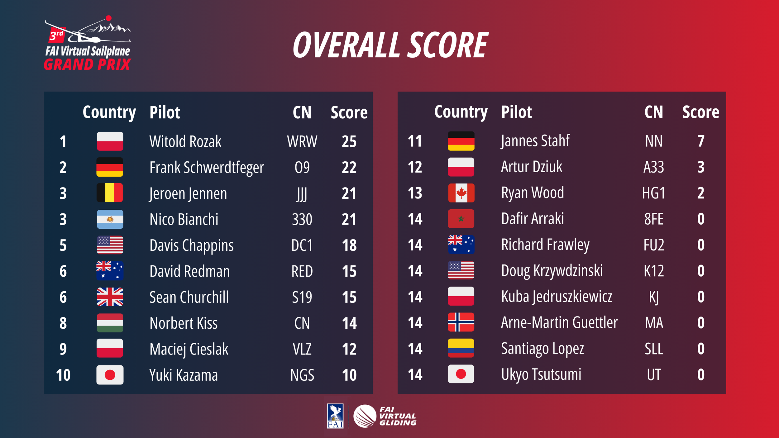 With this victory, Jeroen Jennen moves to 21 points overall, effectively resetting the championship fight. He is now neck-and-neck with Week 1 leader Witold Rozak (Poland), who finished mid-pack in the chaotic final gaggle today. The consistency of David Redman keeps him in the hunt, but the momentum has clearly shifted to the Belgian camp.