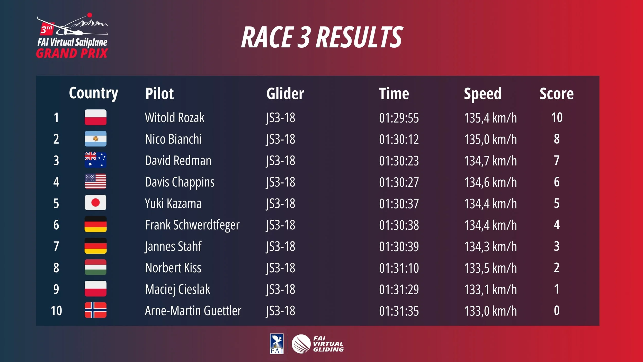 Zeltweg, 26/01/2026 – The first weekend of the 3rd FAI World Virtual Sailplane Grand Prix Final concluded yesterday with a dramatic last leg towards Turnau. After two grueling races, Race 3 took the fleet north into the heart of the Austrian Alps. Launching from the legendary Red Bull Ring at Zeltweg, the pilots faced a complex 203 km task that tested their ability to switch gears between high-mountain flying and the dreaded "blue thermal" conditions of the eastern valleys.